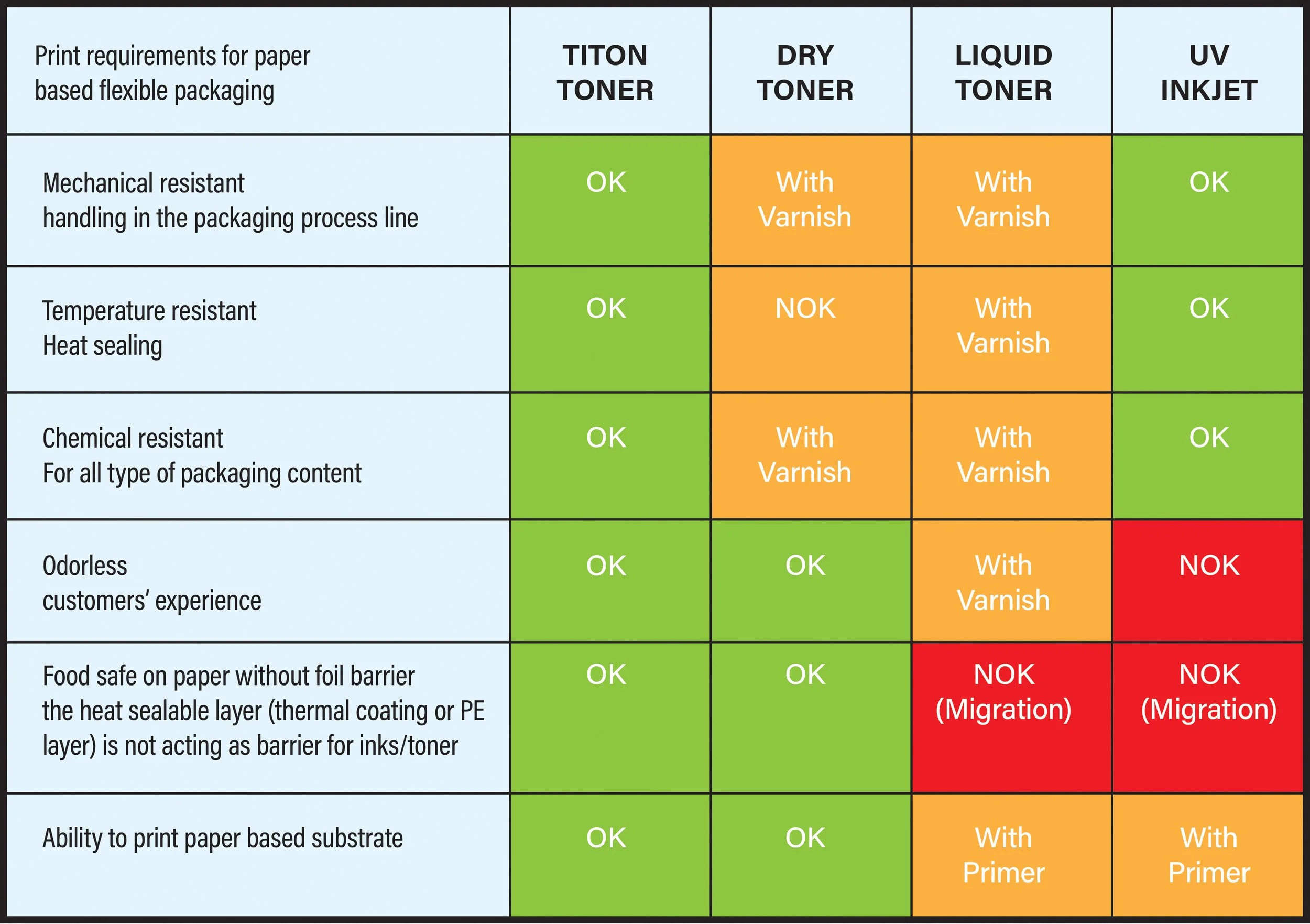 The TITON toner technology, with no liquid components, stands out as the safest digital printing method for food packaging, even when paper is the primary barrier. Its odorless and tasteless nature ensures it won’t interfere with the consumer experience, making it ideal for a wide range of applications involving both indirect and direct food contact.